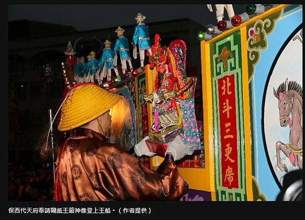 保西代天府奉請糊紙王爺神像登上王船。(作者提供)