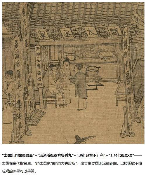 在城區末尾繪有"趙太丞家",裡面有個櫃檯,一位醫者正在為一婦人懷抱的小孩看病。 門前豎著兩個大立招,一個寫著"大理中丸醫腸胃冷",另一個寫著"治酒所傷真方集香丸"。 《清明上河圖》中有很多喝酒的地方,從另外一個角度可以看出當時的人酗酒成風。 此外,大理中丸和集香丸這兩個藥方均來自《局方》。