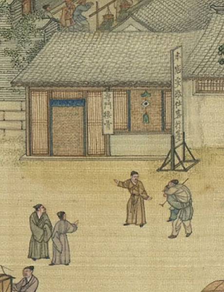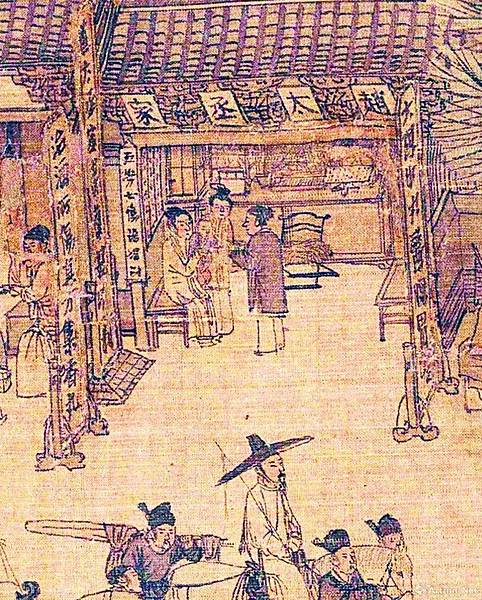 在街市的最西面,有一處坐北朝南、面積較大的門面,大門上方懸掛一匾額,上書“趙太丞家”四個大字。太丞即太醫丞,宋朝為太醫局所屬主管醫藥的官員,為從七品。可見這家藥鋪為趙姓醫官所辦,既是皇姓,又有官方背景,所以所處位置非常優越。大門左右兩側立有高大招牌,西面上寫“治酒所傷真方集香丸”,東面上寫“大理中丸醫腸胃”。集香丸和大理中丸均為中醫方劑名,見於《御藥院方》和《太平惠民和劑局方》,集香丸具有消秋滯之功效,主治傷生冷硬物不消。大理中丸可用於脾虛胸膈痞悶,心腹撮痛,不思飲食。旁邊招牌還有“五勞七傷”“理小兒貧不計利”等字樣。中醫學上五勞指心、肝、脾、肺、腎五臟的勞損;七傷指大飽傷脾,大怒氣逆傷肝,強力舉重,久坐溼地傷腎,形寒飲冷傷肺,憂愁思慮傷心,風雨寒暑傷形,恐懼不節傷志。從這些廣告語可以看出趙太丞擅長內科、兒科,而且杏林春暖,醫德高尚。室內擺有櫃檯和藥櫃,前面設有座椅,上坐一位中年婦女,懷抱小兒,旁有一人站立。婦女前面站立著一位長者,正俯身看視,在為小兒診治,看來此人便是主治大夫趙太丞。