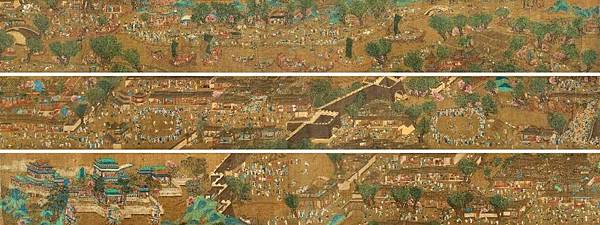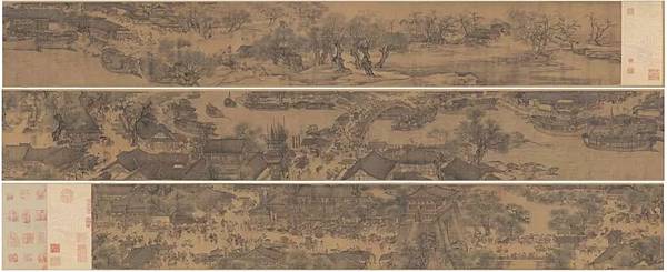 臺北國立故宮博物院藏·清院本《清明上河圖》全圖,由清宮畫院的五位畫家——陳枚、孫祜、金昆、戴洪、程志道在乾隆元年(西元1736年)協作畫成,是參照各朝的仿本、集各家所長之作品。