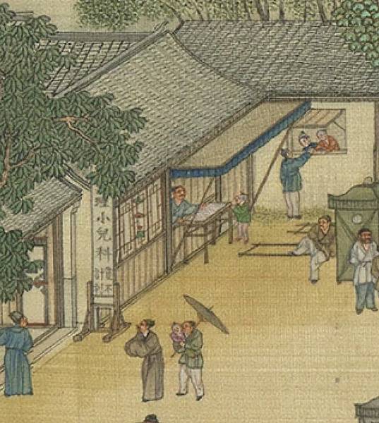 當時汴梁城街道寬闊整潔,路旁樹木蔥鬱,一些庭院百花盛開,環境優雅,不失中華古都特有的文明衛生景象。 畫中可以看到有內科、兒科、骨傷科、祝由科等,分科漸趨精細。 有中醫診所三處,兩處是小兒科,反映當時小兒科診療水準頗高,處於鼎盛時期。 其中四眼井旁有一家臨街的店鋪,門上高懸"趙太丞家"橫匾,門旁對聯留有"五勞六損"四字,招牌上大書"治酒所傷真方集香丸",旁邊幡上還可見到"□理小兒貧不計利"字樣,室內櫃檯旁一醫者正聚精會神地給一婦人懷中的小孩診病。 "丞"是宋太府寺所屬藥局(具有商業性質)領導助手,兼管醫藥;"五勞六損"是一般內傷外感病的統稱。 這個趙太丞大概是位擅長兒科、內科的醫官,熱心行醫,注重醫德,深明"醫乃仁術"之理,故才能做到"貧不計利"。 另一診所門前掛著一個挑子,上寫"專治小兒科",堂內坐著醫生,旁邊有人領著小孩就診,小孩大概怕醫生,欲掙脫跑掉,畫面生動有趣。