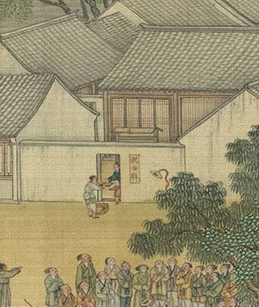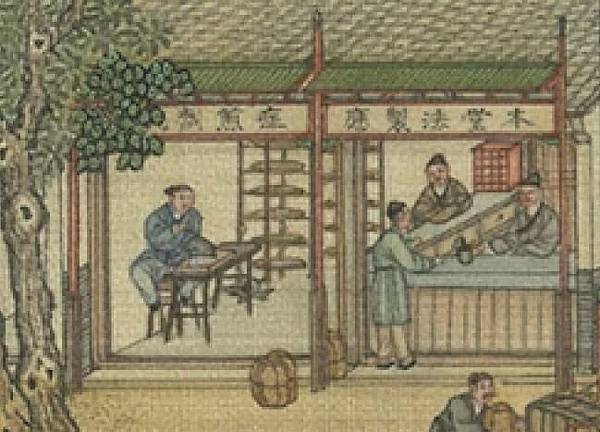 門外有幾個人在稱重,宋朝對藥鋪炮製熟藥、成藥的成分、劑量,炮製方法有一些規定,各藥店必須依"法"來炮製藥材,配製成藥。