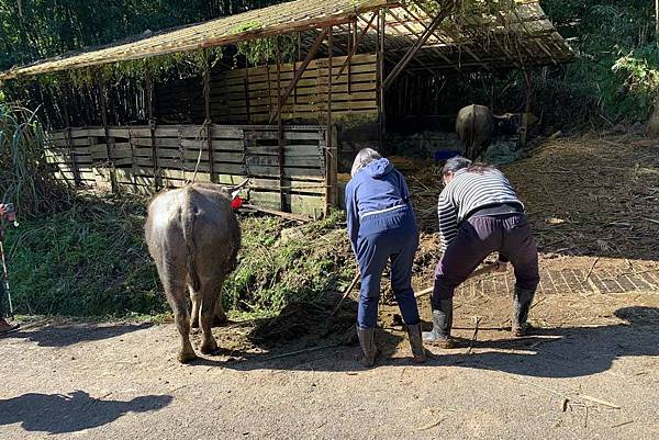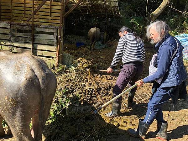 鏟出牛糞、加入粗糠,製作堆肥的過程,對身為農民的我們來說並不陌生。然而照顧六隻牛,就跟照顧一片蔬菜田很不一樣了。水牛雖然被繫在牛棚中,但是「動物」會走動,有食物和排泄的需求,需要足夠的空間也需要良好的動線、維持整潔的環境。一隻牛的體型龐大,體重達數百公斤,相當於養一隻狗的10倍工作量!工作中還得留意牛的心情,注意安全!