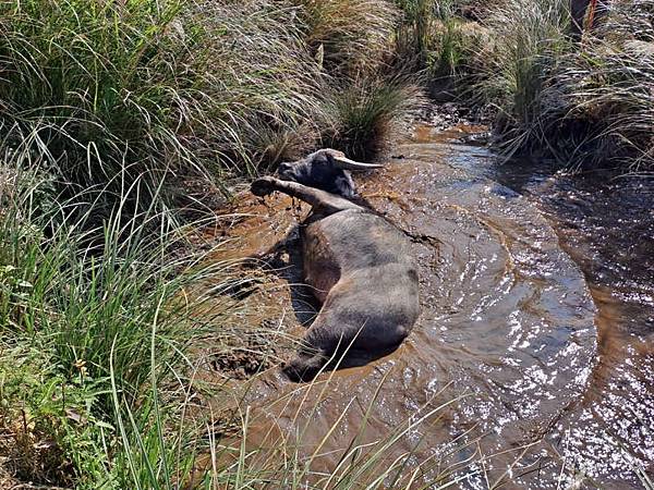 2號公牛見到久違的池塘,馬上狂奔下去洗個泥巴浴 (圖/胡正恆)