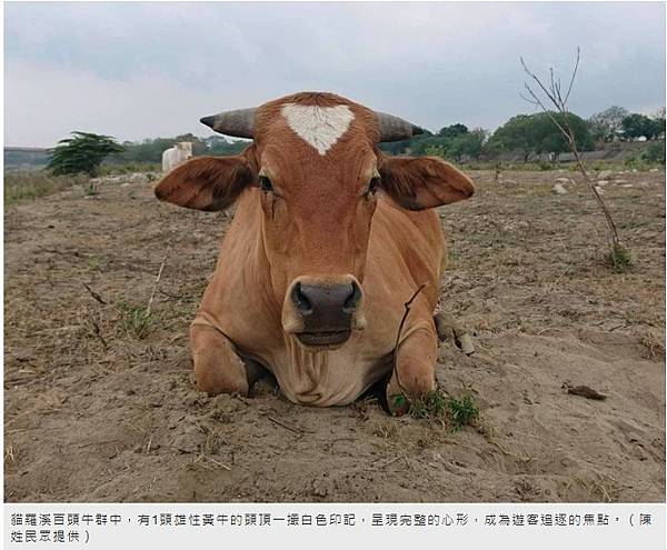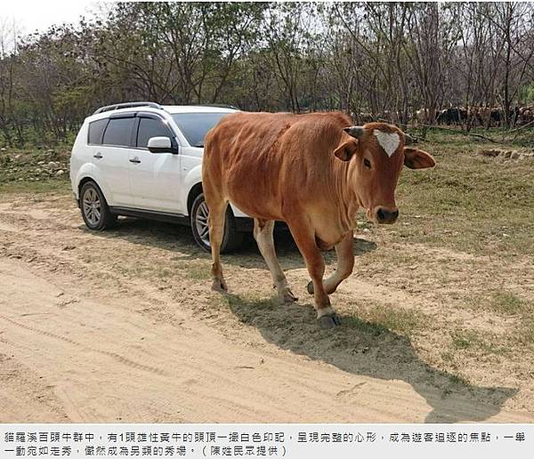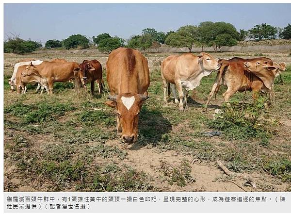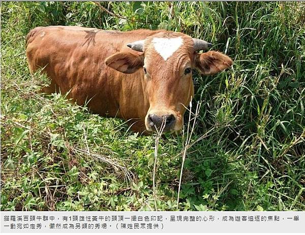 貓羅溪百頭牛群中,有1頭雄性黃牛的頭頂一撮白色印記,呈現完整的心形,成為遊客追逐的焦點,一舉一動宛如走秀,儼然成為另類的秀場。(陳姓民眾提供)