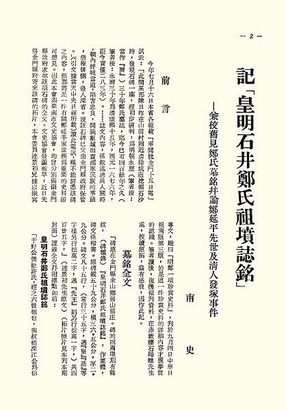 延平郡王薨於東都,穸石之文必有銘誌。余居臺南,久訪未得;即王遺壟,亦無知者。唯歸葬後,克塽重撰墓誌僅載世系而事功不敢一言,蓋有所忌也;今錄於左。他日苟得前誌而讀之,必足以補舊史之缺。王父諱成功,字明儼,號大木;姓鄭氏。先世自光州固始縣入閩,居漳、居粵之潮;至始祖隱石公,乃移於泉之南安縣楊子山下石井鄉,遂世為南安人。數傳至八世祖樂齋公,樂齋公傳於野公,於野公傳西庭公,西庭公傳象庭公,象庭公傳曾大父飛黃公,實生王父。曾大父丈夫子六,王父居長;再傳丈夫子十,父又居長。王父生於甲子年七月十四日辰時、卒於壬寅年五月初八日未時,享年三十有九。故明末,賜國姓,封延平王;率眾取海外臺灣,開闢疆土,設立府縣居之。父諱經,字式天,號賢之,嗣封延平王;生於壬午年十月初二日未時、卒於辛酉年正月二十八日寅時,享年四十:同王父俱葬臺灣。歲癸亥,不孝克塽等舉國內附,挈眷入京,蒙恩封漢軍公。念臺灣遠隔深海,祭掃維艱;具疏陳情,乞遷葬地,奉特旨恩准。爰令弟克舉假回襄事,以康熙三十八年五月二十二日卯時附葬於南安縣康店鄉樂齋公塋內,並曾大父靈主、曾祖母翁、祖母董、母唐柩附焉。翁曾祖母生於壬寅年八月十八日未時、卒於丙戌年十一月三十日巳時,享年四十有五。祖母董係明進士禮部侍郎董諱颺先公胞姪女,生於癸亥年九月二十四日酉時、卒於辛酉年六月十六日巳時;享年五十有九。母唐為明進士兵部尚書唐諱顯悅公孫女,生於壬午年十二月十二日未時、卒於丙午年七月二十四日丑時,享年二十有五。王父生平事蹟,先卜葬臺灣,已悉前誌。茲第敘其生卒月、世系子姓納諸幽壙,用示後之子孫。王父子十:長即吾父,娶母唐氏,先卒;次聰,娶明魯王郡主朱氏;次明,娶林氏;次睿;次智,娶洪氏;次寬,娶林氏;次容,娶王氏;次溫,娶劉氏;次柔,娶洪氏;次發。女四:長適柯諱良、次適甘諱孟煜、次適洪諱允中、次適明魯王世子朱諱弘桓。父男七:不孝克塽居長,娶馮氏、史氏;次克□,娶許氏;次克均,娶柯氏;次克□,娶馮氏;次克睦,娶趙氏;次克圻,娶張氏;次克塙,娶劉氏。女六:長適黃諱肇隆、次適黃諱肇燦、次適陳諱逢泰、次適甘諱純仁、次適趙諱繼麟、次未配。自聰出者,子一克坦,娶李氏;女三:長適陳、次適柯、次適洪。明無出;以裕之子為嗣,未娶。睿早夭。自智出者,子一克璋,聘洪氏。自寬出者,子一克培,娶朱氏。自裕出者,子二:長克崇,未聘;次克俊,出繼與明為嗣。女一,未配。自溫出者,子三;長秉模;次克圭,出繼與發為嗣;次克傑:俱未聘。女一,未配。自柔出者,子一克璽,未聘;女二:長適洪、次適許。發亦早夭,以溫之子克圭為嗣。不孝克塽子三:長安世、次安邦、次安國、俱未聘;女二,未配。克□女二,未配。克均子一安甸,未聘。克□女一,未配。餘未艾雲。山坐巽向乾,兼己亥、庚辰、庚戌分金,在南安縣三十八都,土名康店鄉。銘曰:鴻漸之麓,佳城鬱蒼;山環水繞,迴抱崇岡:惟予先世,靈魄是藏。迨及父祖,遠葬殊方;卜遷協吉,歸此故鄉。祖孫共穴,父子同堂;渙而得萃,於禮為常。聯綿遺澤,浩蕩恩光。長依北闕,駿發其祥;後人守之,永世不忘。