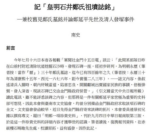 泉州市鄭成功學術研究會鄭榮都先生等通過早報公佈這一重要研究結果。