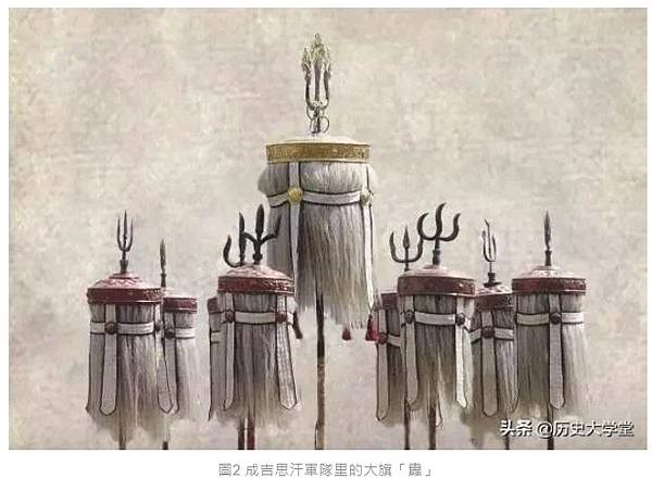 現代復刻的成吉思汗的九游白纛(查干蘇魯錠),蒙古人纛頂沒有用金吾,而是用了馬叉,這個被韓國人學去了: