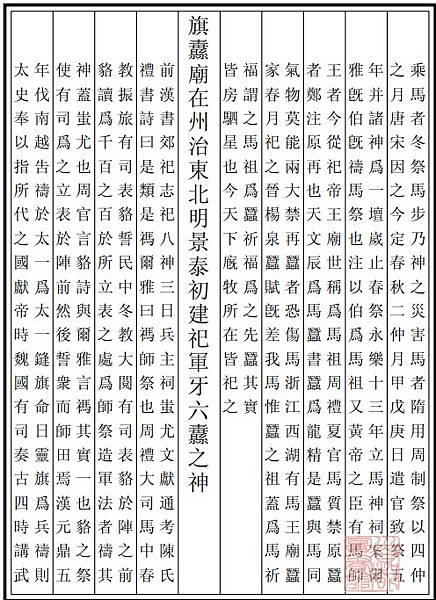旗纛廟:新譙樓西內有祠祀。鎮守勞績於地方者,每歲行禮於霜降日。歲久不葺,廟貌門桓皆頹。嘉靖十九年,都御史南澗楊公守禮修治煥然,公自識之曰:『旗纛乃軍牙六纛之神,將領之司命也。況寧夏極臨邊界,尤用武之地,斯廟之設,誠知所重。』數年來,門墻屋宇圮於風雨,雖歲有常祭,僅如故事。庚子春,南澗子閱而傷之,遂命指揮方輿督其工,隨事處分。工食木瓦,月餘而成,煥然一新,可以萃靈棲神也。[17]