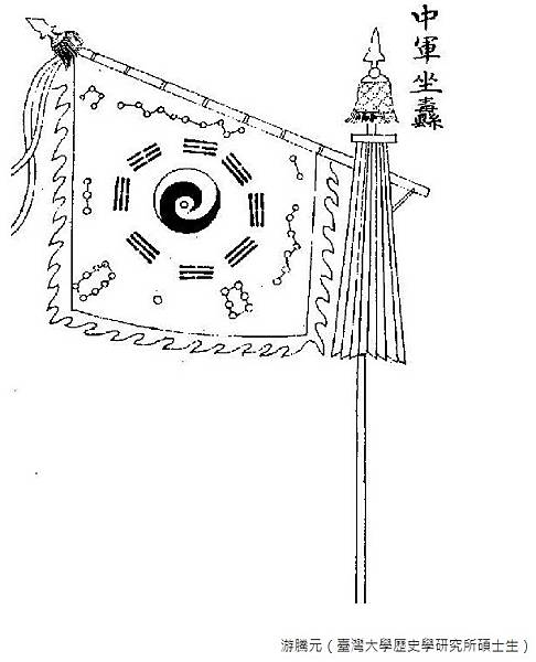 戚繼光紀效新書塗漆木葫蘆旗頭的簡裝旗纛,牙旗圖案是二十八宿或六丁六甲神,也與方位有關: