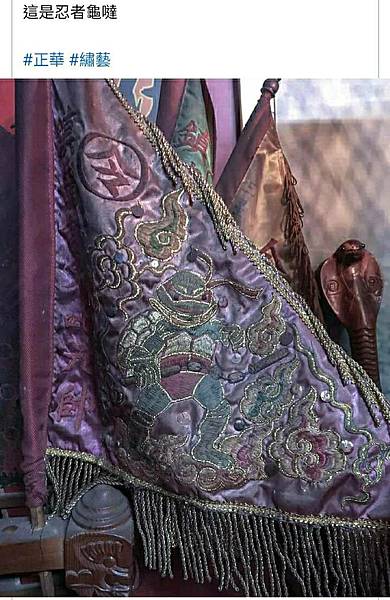 韓國古裝儀仗隊的旌旗,注意後排幾個旗頭,羽毛被剪平順了:
