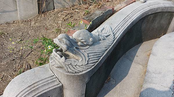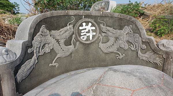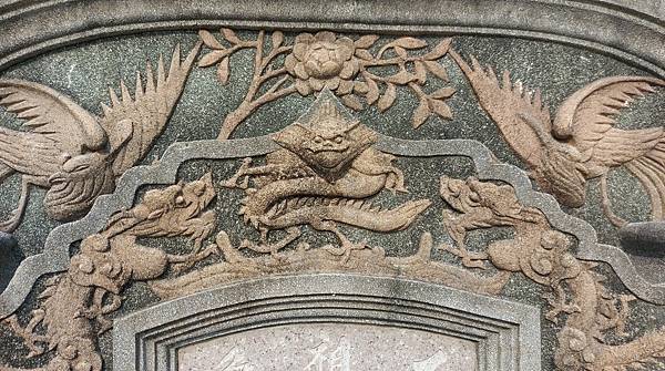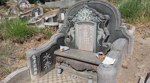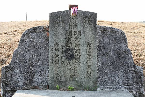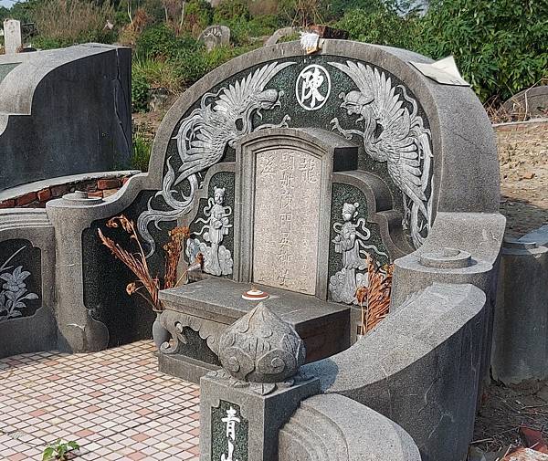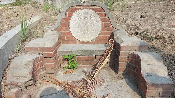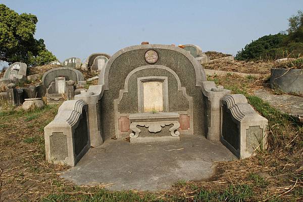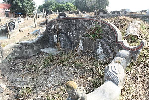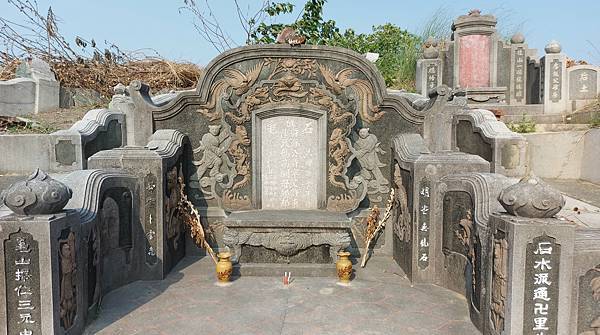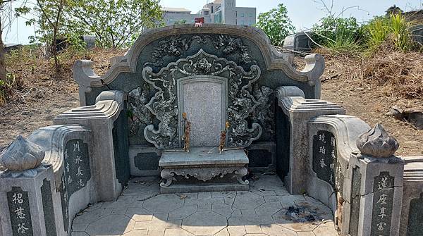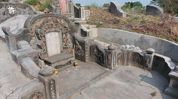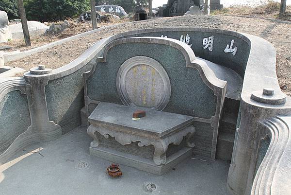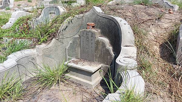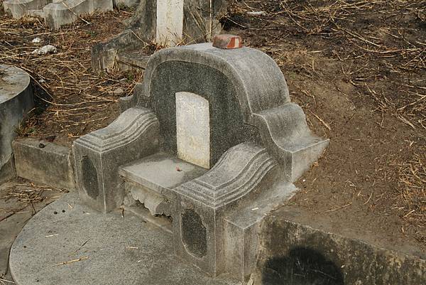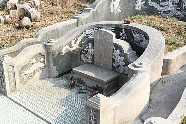 完整製作出碑首、碑身與碑座、墓桌、翅仔等構件,難得一見。後面還有內宅、左右有水口。翅仔左右還添加了兩根柱子,頂端有圓球,形似西洋柱,這種造型在日本時代的洋樓大門、大正時期的街屋牌樓上經常可以見到