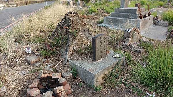 墓碑被整個以磚、灰泥包覆起來,並形塑成出頭式墓碑的造型(暫且稱之為背牆)。據說是因為戰後墓碑經常被偷,才將墓碑整個包覆起來