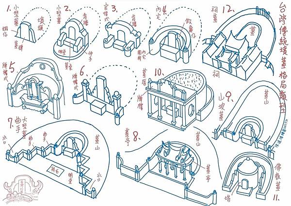 清代王得祿是一品大官,他的墓表現出高等級做法,墓碑有頂部的碑首、中間的碑身,底部按說有碑座,從遠方看整體,墓桌就相當於碑座。墓碑左右還有翅仔(或稱墓耳、墓肩),總共七片石材拼組成正面,稱為七合碑,這是最高等級的作法。另外還有三合碑、五合碑的作法。(6) Facebook https://bit.ly/3nLr9Hr