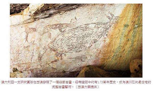 就拿最近最新的發現來說,今年2021年2月22日,《自然人類行為》(Nature Human Behaviour)期刊上發表了一篇研究論文,這是有關澳大利亞的西澳大學(UWA)和墨爾本大學(UM)的研究人員共同合作的一個研究,在西澳東北部的金伯利(Kimberley)地區發現的一幅畫——袋鼠岩石壁畫,岩畫位於一塊岩石掩體的傾斜天花板上,畫作約2米長,紅褐色,與袋鼠實際大小相彷。最特別的是,經專家們考證,這幅畫距今約有1.73萬年歷史,成為澳洲已知最古老的完整岩畫藝術,畫中的袋鼠形象栩栩如生。