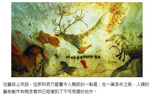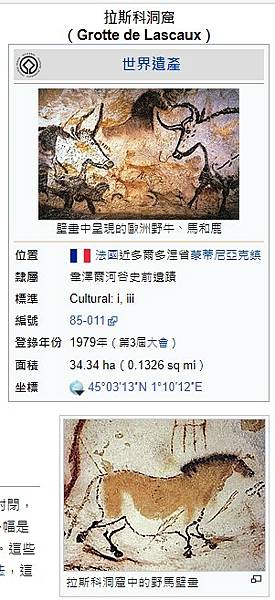 其中有一個外形不規則的圓廳最為壯觀,洞頂畫有65頭大型動物形象,有從2米到3米長的野馬、野牛、鹿,巨大公牛有4頭,最長的超過5米,真是驚世的傑作。這就是拉斯科洞穴(法語:Grotte de Lascaux)壁畫。被譽為「史前的盧浮宮」,真的是超越時空的藝術。