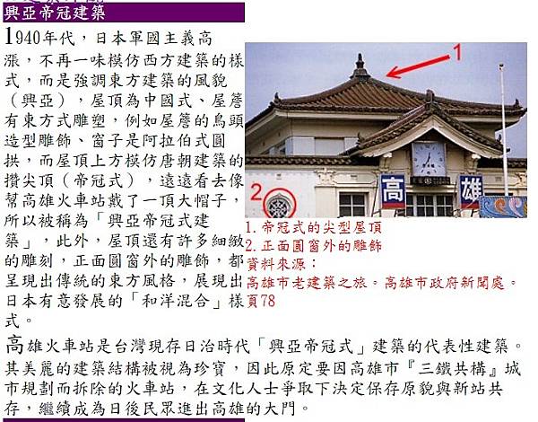 何謂「興亞帝冠式」建築,就是出現在1940年代,日本軍國主義高漲的時代,不同於以往模仿西方建築的樣式,「興亞」是強調東方建築的風貌,屋頂為中國式、屋簷呈現東方建築的風貌和東方式雕塑、窗子是阿拉伯式圓拱,而其屋頂上唐朝建築的尖頂,如同戴上一頂冠帽,所以也稱為「帝冠式」。這種樣式,通常出現在官方建築,其中代表作是台北司法大廈、高雄車站、高雄市役所(市政府,現今歷史博物館)。