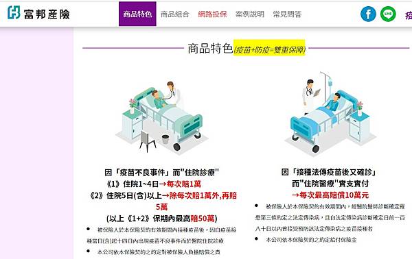 至於富邦產險的承保項目,包括疫苗不良事件費用補償保險、法定傳染病疫苗預防保障定額補償健康保險、法定傳染病疫苗預防保障實支實付住院醫療保險,須同時承保2或3項。