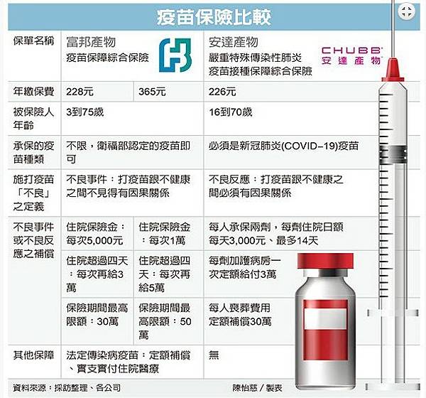 不過,富邦產的整張保單有效期間,施打各種疫苗的不良事件補償,合計上限可達30萬元。安達產只承保新冠疫苗兩劑,合計住院補償上限為14.4萬元。