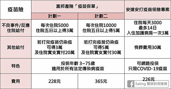 4/16才剛推出疫苗險,還好目前市面上只有兩家,不像上次防疫保單實在太多家,我整理了好久。