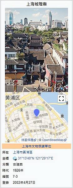 上海城隍供奉縣城隍老爺顯佑伯為主神,是上海最主要的道教正一派道觀,也是上海市文物保護單位與著名景點,毗連豫園。上海城隍廟始建於明永樂元年,由原霍光行祠改建而成,建廟迄今已有615年之歷史。此後歷經多次擴建,於清朝道光初年達到鼎盛。民國13年中元節發生火災而被毀。民國15年重建,並於次年落成。寺廟巡禮-上海老城隍廟城隍老爺 @ 這是我的部落格 :: 隨意窩 Xuite日誌 https://bit.ly/3o0Jal2