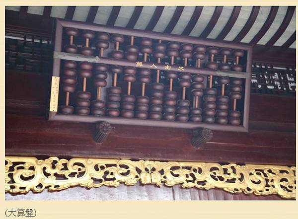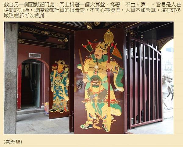 中路第二座建築為儀門,懸一算盤,其上刻「不由人算」,其算珠有上、下,與儀門對聯相配「世事何需多計較」、「神界自有大乘除」。同時,儀門為兩層,二層面向大殿一側日常為經堂,逢城隍及城隍夫人誕辰時,將會卸下木窗,改做為戲台[15]。