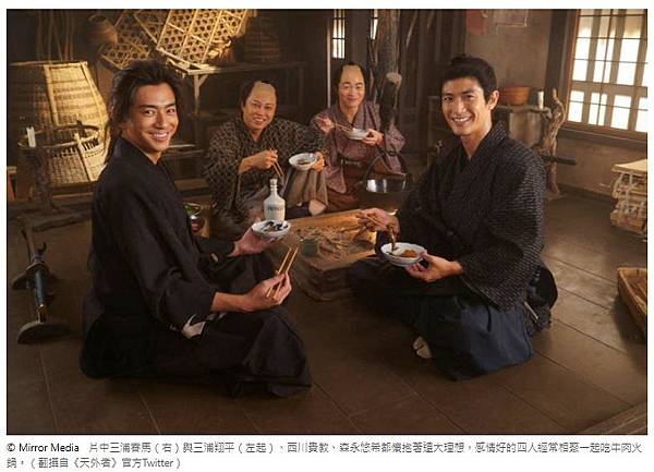 片中三浦春馬(右)與三浦翔平(左起)、西川貴教、森永悠希都懷抱著遠大理想,感情好的四人經常相聚一起吃牛肉火鍋。(翻攝自《天外者》官方Twitter)© Mirror Media 片中三浦春馬(右)與三浦翔平(左起)、西川貴教、森永悠希都懷抱著遠大理想,感情好的四人經常相聚一起吃牛肉火鍋。(翻攝自《天外者》官方Twitter)