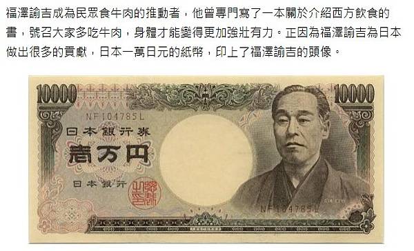 福澤諭吉成為民眾食牛肉的推動者,他曾專門寫了一本關於介紹西方飲食的書,號召大家多吃牛肉,身體才能變得更加強壯有力。正因為福澤諭吉為日本做出很多的貢獻,日本一萬日元的紙幣,印上了福澤諭吉的頭像