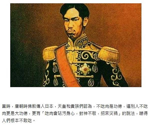當時,唐朝時佛教傳入日本,天皇和貴族們認為,不吃肉是功德,逼別人不吃肉更是大功德,更有「吃肉會玷污身心,對神不敬,招來災禍」的說法,嚇得人們根本不敢吃。