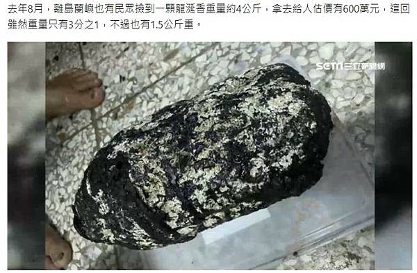去年8月,離島蘭嶼也有民眾撿到一顆龍涎香重量約4公斤,拿去給人估價有600萬元,這回雖然重量只有3分之1,不過也有1.5公斤重。