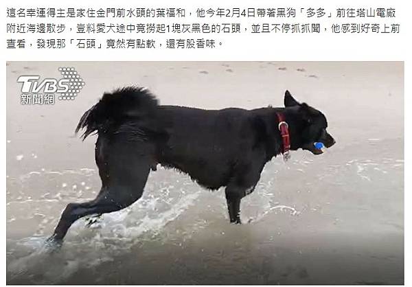 這名幸運得主是家住金門前水頭的葉福和,他今年2月4日帶著黑狗「多多」前往塔山電廠附近海邊散步,豈料愛犬途中竟撈起1塊灰黑色的石頭,並且不停抓抓聞,他感到好奇上前查看,發現那「石頭」竟然有點軟,還有股香味。