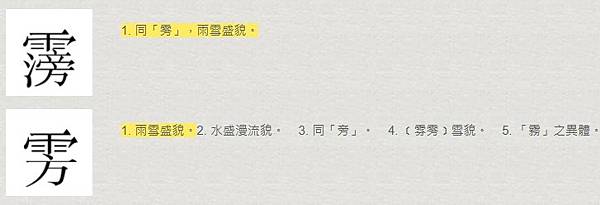 又《集韻》《類篇》𠀤敷方切,音芳。 位數雱,雪貌。 《集韻》本作滂,沛也。 或作霶䨦