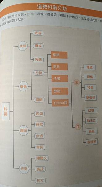 現在一般將科儀分為戒律、威儀、讚頌、表奏四類。這一分法,源於南朝劉宋時期的道士陸修靜。戒律指約束道教徒行為和道德的基本準則;威儀主要指齋醮和行持,齋醮即前面所講的內外齋,行持則包括各種齋壇、醮壇的設立以及道士舉行科儀時所用的法器、法服和供品等等;讚頌主要指科儀所使用的語言,包括經頌詩歌、步虛、青詞等多種形式;表奏指和科儀有關的文字,如章奏、表申、關膜、榜文、禮懺文、奏疏等等。