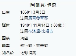 Albert Kahn 阿爾伯特-卡恩,法國銀行家、慈善家,1860年出生在法國一個貧困的家庭,父親是販牛人,在他十歲的時候,疼愛她的母親積勞成疾離開了他。悲傷的父親帶著4個孩子搬到聖米歇爾,靠做些小生意度日。