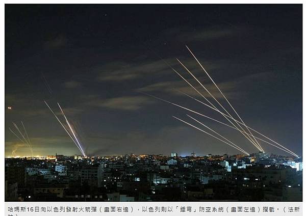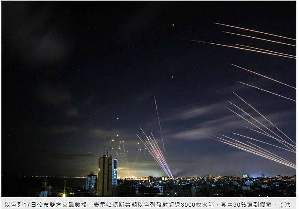 〔即時新聞/綜合報導〕以色列與巴勒斯坦激進組織「哈瑪斯」(Hamas)近日爆發戰事,雙方連續交戰至今已第8天。以色列17日公布雙方交戰數據,指哈瑪斯一共朝以色列發射超過3000枚火箭,其中90%遭攔截;以色列也公開了打擊哈瑪斯「恐怖份子」的成果。