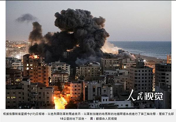 根據俄羅斯衛星網今(17)日報導,以色列國防軍新聞處表示,以軍對加薩的哈馬斯的地鐵隧道系統進行了第三輪攻擊,摧毀了北部15公里的地下設施。