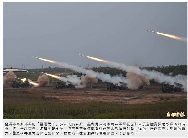 金馬外島所部署的「雷霆兩千」多管火箭系統,是利用台灣本島各軍團實施聯合反登陸實彈射擊操演的時機,將「雷霆兩千」多管火箭系統,連官兵帶裝備都運到台灣本島進行射擊,強化「雷霆兩千」部隊的戰力。圖為過去軍方漢光演習期間,雷霆兩千在澎湖進行實彈射擊。(資料照)