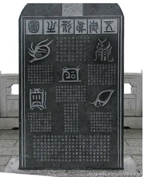 1、是五嶽的地形圖,表示五嶽地貌形狀特徵,屬道教的地學範疇,即"泰山如坐"、"華山如立"、"恆山如行"、"衡山如飛"、"嵩山如臥";