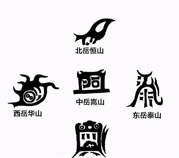 3、是形象化的象形學,東嶽為"龍"字,西岳為"底"字,北岳為"龜"字,南嶽為"鳥"字,中岳為"奧"字;