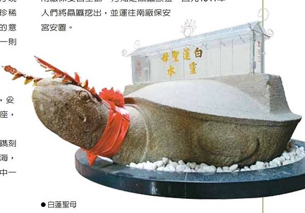 但這十座記功碑渡海來台的途中出了包,其中一座失落在台灣海峽之中,數百年來滄海滄田,當初那座記功碑失落之處也成為魚塭,卻常發生一些難以解釋的神秘事件,如魚塭中的魚失蹤、或是魚塭半夜會發出亮光,當地居民因而請示保安宮五腑千歲。1911年時五府千歲指示掘出僅剩底座的贔屭像,並移至南廠保安宮內,當地人稱為白蓮聖母。
