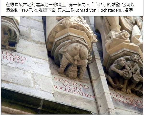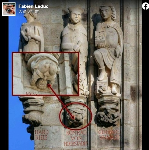 在德國最古老的建築之一的牆上, 有一個男人「自含」的雕塑. 它可以追溯到1410年, 在雕塑下面, 有大主教Konrad Von Hochstaden的名字--在德國最古老的建築之一的牆上, 在一座大型雕像後面, 有一個男人自己進行口交的雕塑. 它可以追溯到1410年, 沒有人知道為甚麼或如何結束.在奇怪的雕塑下面, 有個大主教Konrad Von Hochstaden的名字, 讓它更奇怪, 因為它是一個宗教人物.其中一個理論是, 這個雕塑的創建是為了抗議權威, 以粗魯的方式顯示性行為, 他們想表明自己並不關心道德, 甚至公共秩序. 宗教當局. 它仍然存在的唯一原因是裸眼可以看到, 你必須用眼睛去尋找它, 還是很難看到它, 因為它非常高.