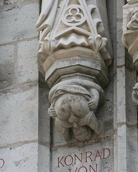 很傻眼吧!底座上有個無名男子的雕像,保持著彎腰脫褲姿態,嘴巴裡....正含著自己的陰莖,一看就知道有練過,畢竟坐姿體前彎不到40公分的人,可能拼死都辦不到這件事。上頭的大主教Konrad von Hochstaden一臉正經,他就是在1248年時主持興建科隆大教堂的名人,但這更讓人疑惑了,為何一位歷史知名的大主教,底下居然要搭配一位「自己取悅自己」的男人雕像。