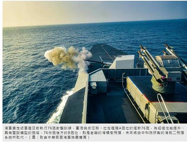 海軍康定級軍艦日前執行76砲射擊訓練,圓滿完成任務。位在艦艏A砲位的這款76砲,為經過性能提升丶具有匿蹤構型的砲塔,76快砲後方的B砲位,則是老舊的海欉樹飛彈,未來將由中科院研製的海劍二飛彈系統所取代。(圖:取自中華民國海軍臉書專頁)