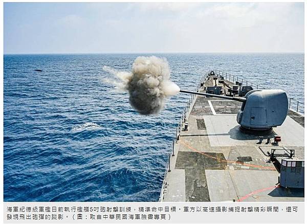 海軍也在臉書專頁上發佈多張實彈射擊操演照片,呈現軍艦上76砲、5吋砲、方陣快砲等多種武器實彈射擊的精采畫面,展現海軍官兵平時勤訓精練成效及海軍堅實戰力。
