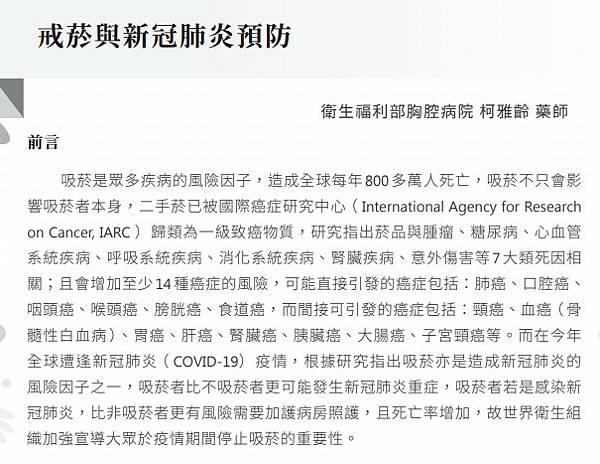 菸害防制倡議宣導專文ㄧ:新冠肺炎與戒菸