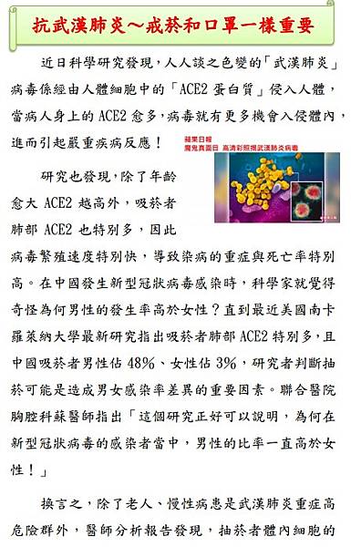 一、 吸菸者有較高的新冠肺炎病毒受體(ACE-2),易增加感染新冠肺炎的風險。