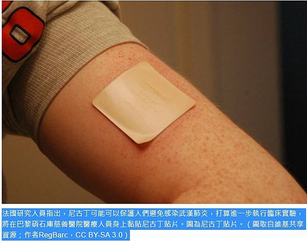 法國研究人員指出,尼古丁可能可以保護人們避免感染武漢肺炎,打算進一步執行臨床實驗,將在巴黎硝石庫慈善醫院醫療人員身上黏貼尼古丁貼片。圖為尼古丁貼片。(圖取自維基共享資源;作者RegBarc,CC BY-SA 3.0)研究:尼古丁可能有助降低新冠病毒感染風險 | 國際 | 中央社 CNA https://bit.ly/3oXL72m