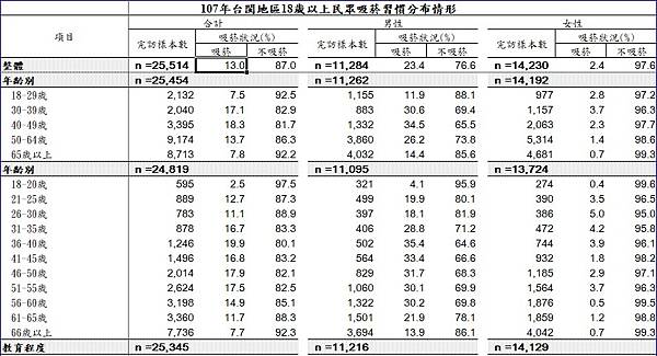 衛福部國健署進行年度「國人吸菸行為電話調查」,去年度完訪樣本計2萬5514人。調查顯示,我國整體吸菸率自98年的20%降至107年的13%。在107年的數據中,31歲至60歲族群的吸菸率在14.9%至19.9%不等,高於全年齡平均值;其中31歲至35歲、36歲至40歲年齡層的吸菸率,相較去年微幅升高,其餘年齡層的數字則降低。
