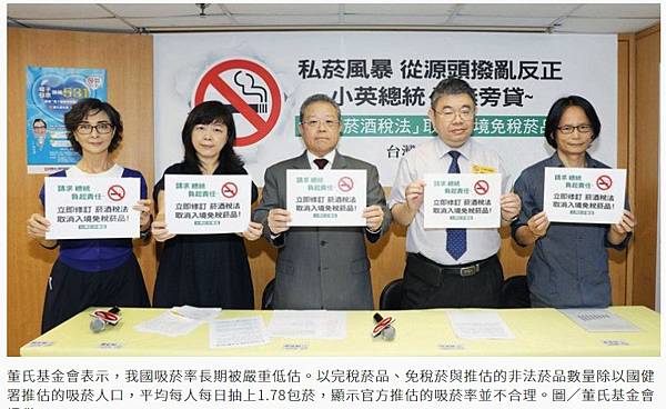董氏基金會菸害防制中心主任林清麗表示,我國吸菸率長期被嚴重低估,以去年數據為例,去年完稅菸品消耗量約14億包,加上免稅菸1.5億包,以及非法菸品約占6%、約為0.8億包,推估總消耗量高達約16.3億包,除以國健署推估的吸菸人口252萬人,平均每人每日抽上1.77包菸,顯示國健署推估的吸菸率並不合理。