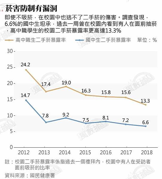 台灣菸害防制推動看似頗有成效,但根據國民健康署2018年的調查,就連應屬「全面禁菸場所」的校園,都有6.6%國中生坦承過去1周曾在校園內看到有人在面前抽菸,而這樣的現象在高中職校園更是嚴重……。究竟台灣走向「無菸」之路,還有多少阻礙與挑戰?
